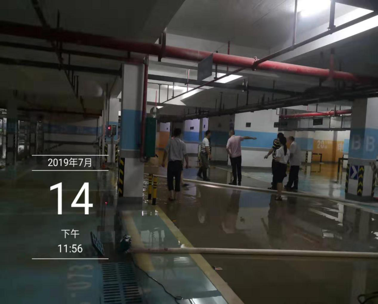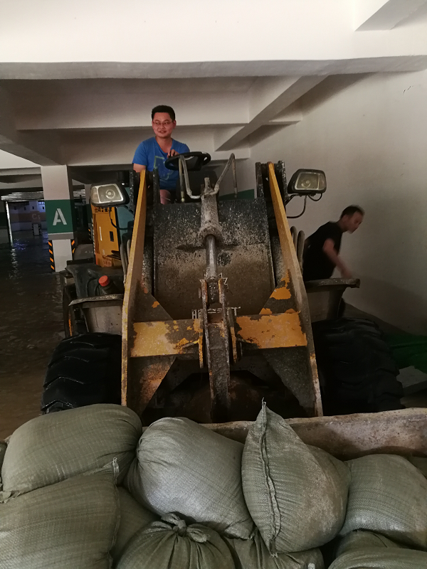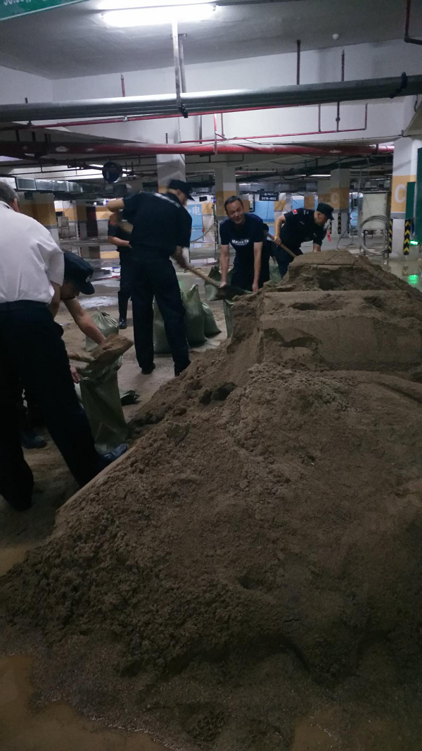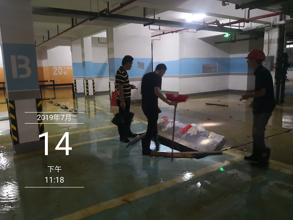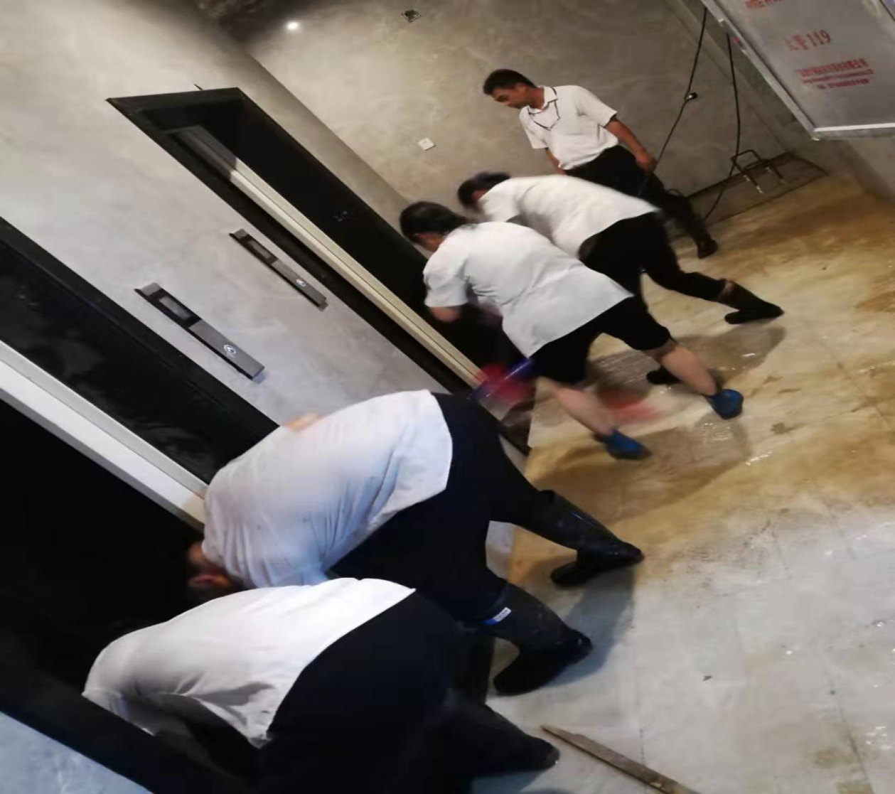 一小部分水進入到負二層地下室,為防止雨水進入電梯造成更大的損失,電梯公司停止了電梯的運行,統(tǒng)一將電梯升至負一層,電梯底坑少量積水,為快速恢復電梯,在集團公司領導快速響應、指導下,2019年7月14日,棠棣之華項目部、物業(yè)公司、電梯公司日夜奮戰(zhàn)在第一線,調(diào)配能調(diào)動的所有資源,扛沙袋、清垃圾、處理積水,一定要確保在7月14日恢復所有停運的電梯,保障業(yè)主的正常出行!